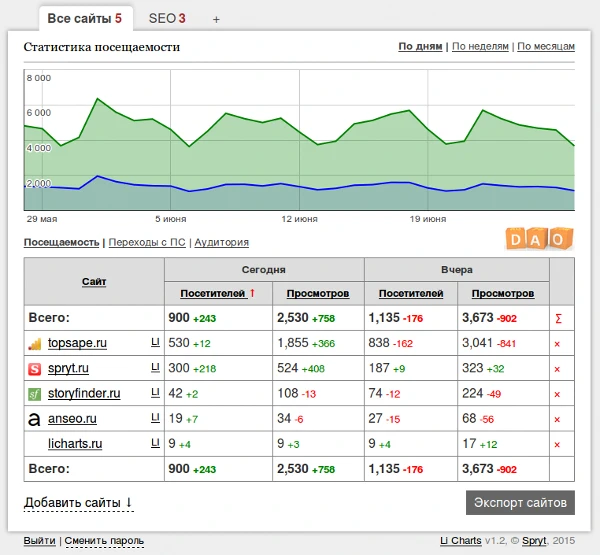 Скрипт LiCharts объединяет статистику ваших сайтов из LiveInternet, строя график по суммарным данным посещаемости, а так же предоставляя удобный мониторинг текущей активности всех сайтов на одной странице.